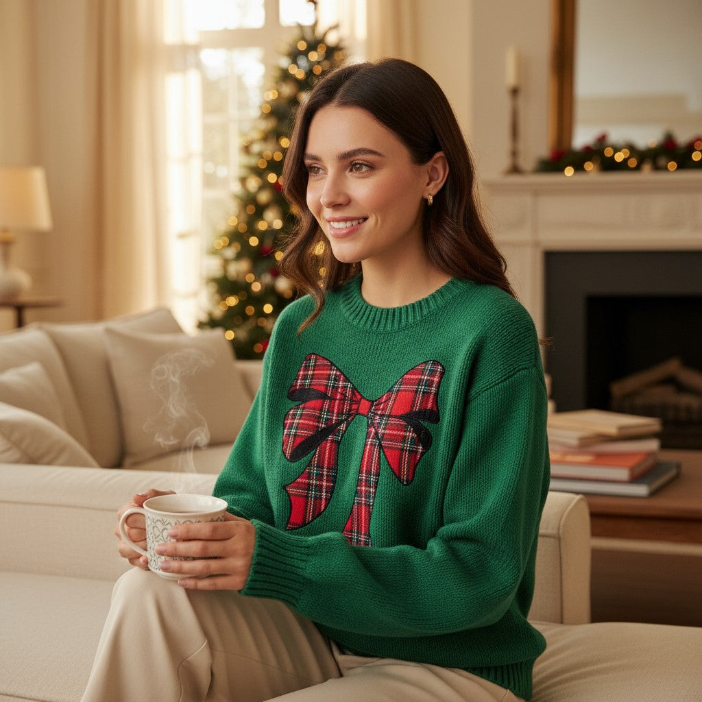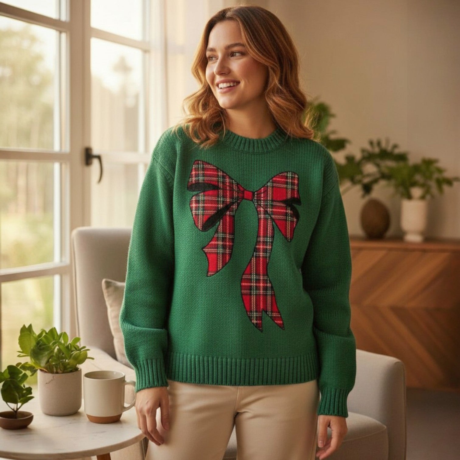MERRY MOMENTS SWEATER with a cozy fiery red knit and festive white and gold ribbed neckline for the holiday season.
