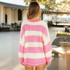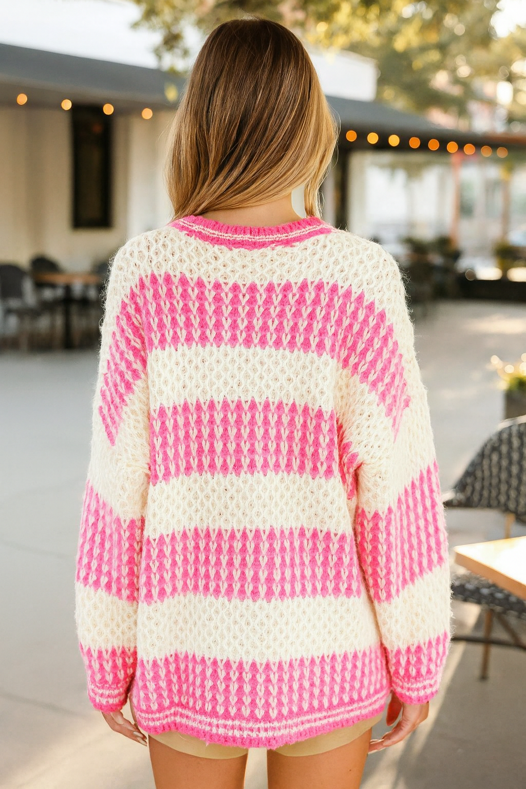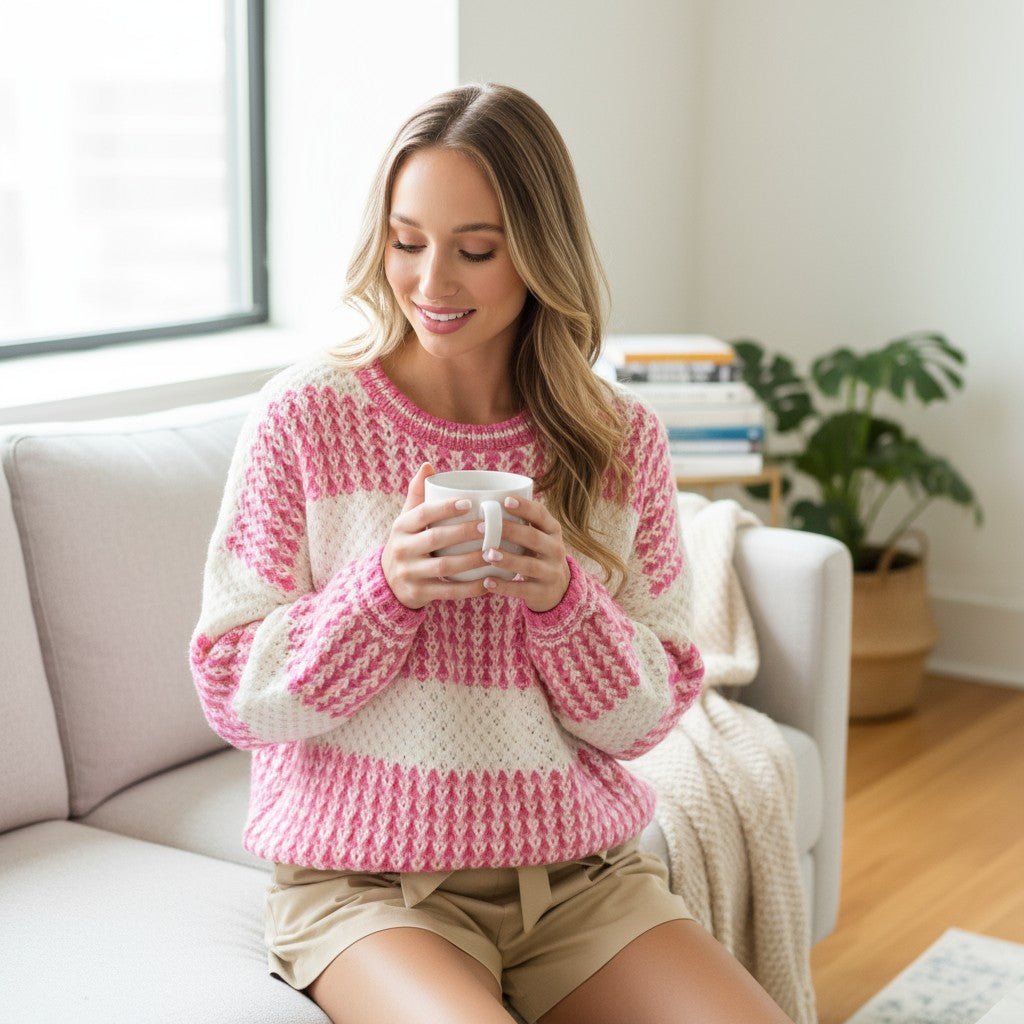 Get wrapped in sweetness with this ultra-soft fuzzy knit! The Strawberry Sugar Sweater features warm blush-and-cream stripes and a cozy relaxed fit that feels like your favorite blanket—but make it stylish. The fuzzy texture and roomy cut make it perfect for fall, winter, lounging, or layering.