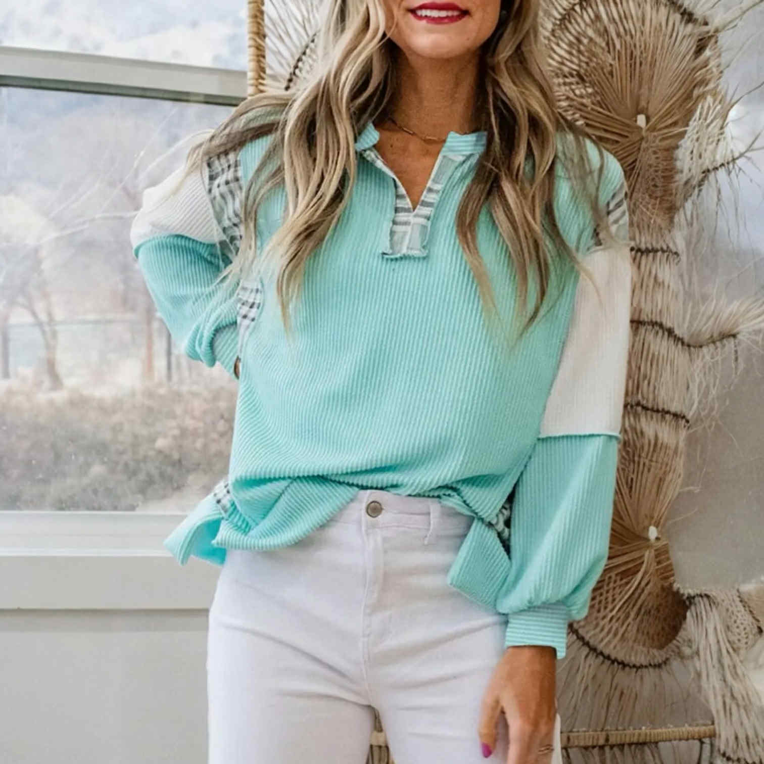 🌊 Aqua Avenue Ribbed Pullover – Playful Patchwork Meets Everyday Comfort 🌊