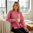 Introducing the Flex Time Crew Neck in sweet pink color. This oversized, 100% cotton knit top features a comfortable, mineral-washed French Terry fabric. Perfect for cooler months, it boasts a relaxed fit, round crew neck, and stylish stitch details. A front hem slit adds a touch of modern flair. Stay comfy all day long!