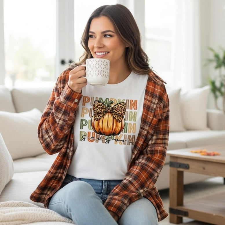 Celebrate the season in style with the Pumpkin Party Tee, the perfect blend of cozy, cute, and festive! This fun fall shirt features a leopard print pumpkin with a sweet bow graphic and bold “PUMPKIN Season” lettering that brings all the autumn vibes.