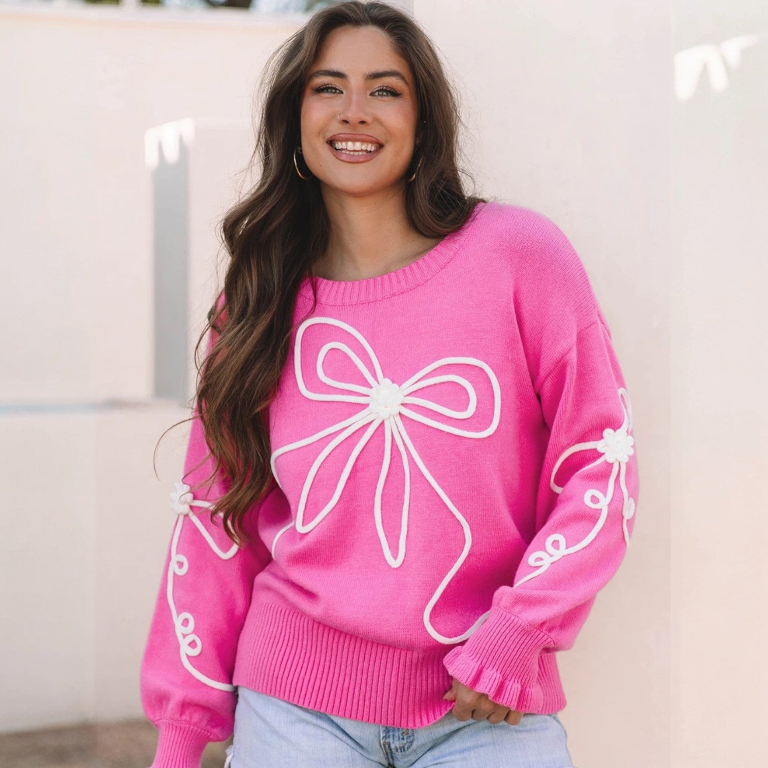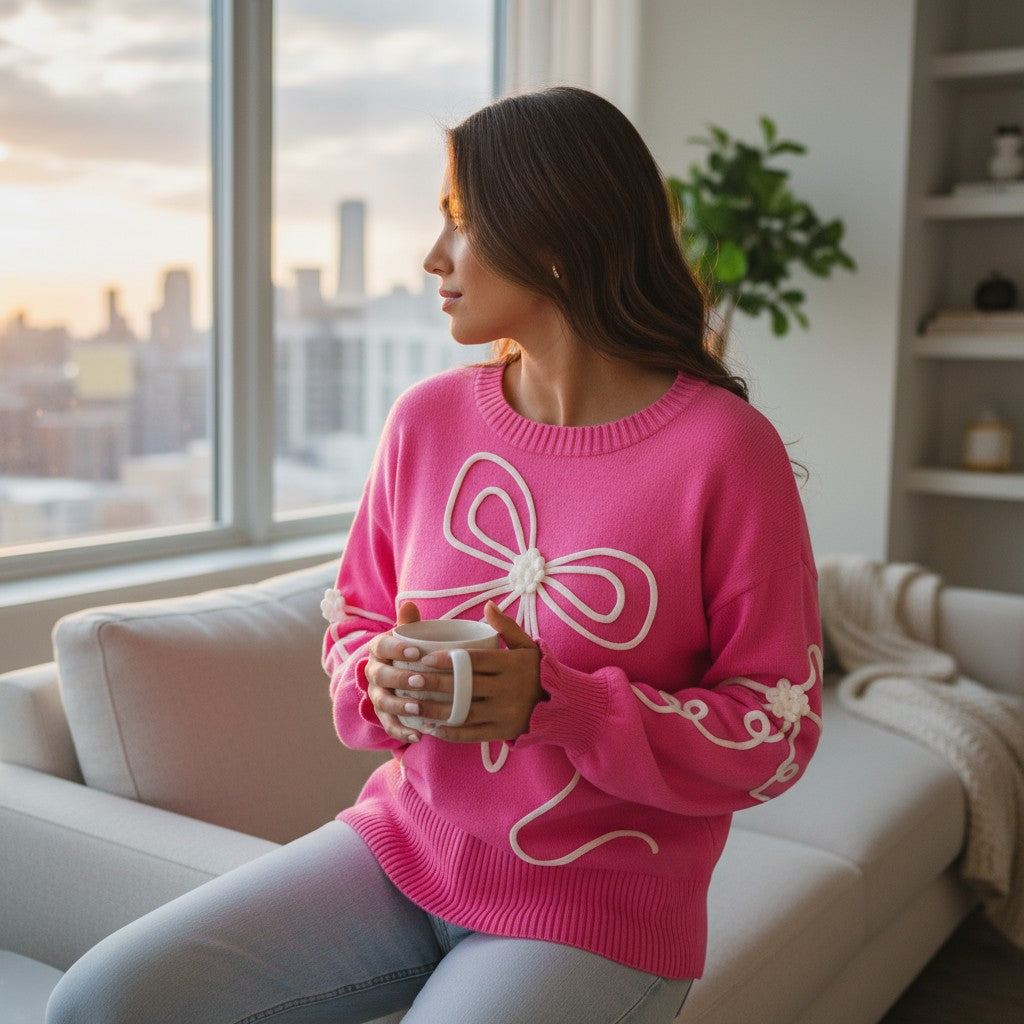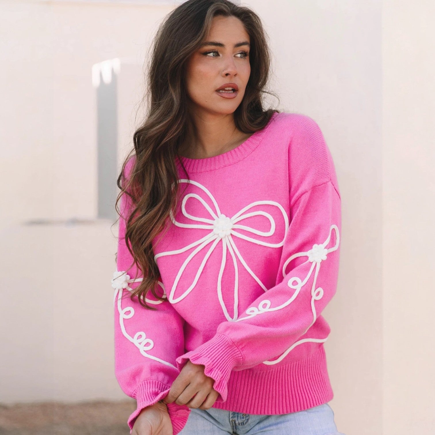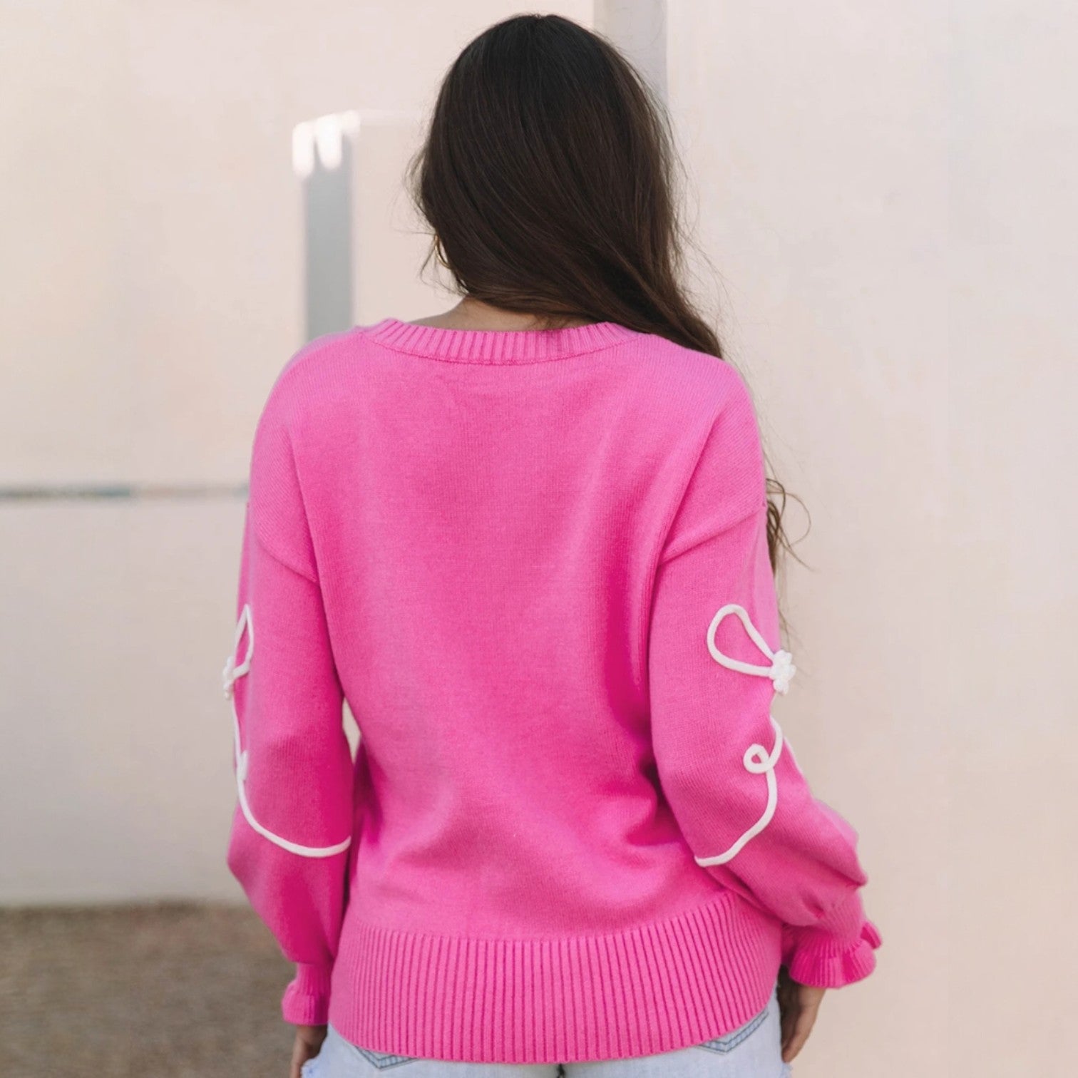 Spoil yourself with a moment worth remembering — this pretty-in-pink sweater brings sweet charm and playful detail to every outfit.