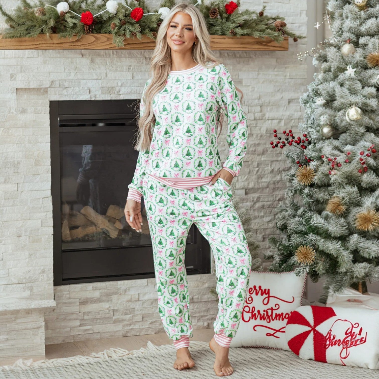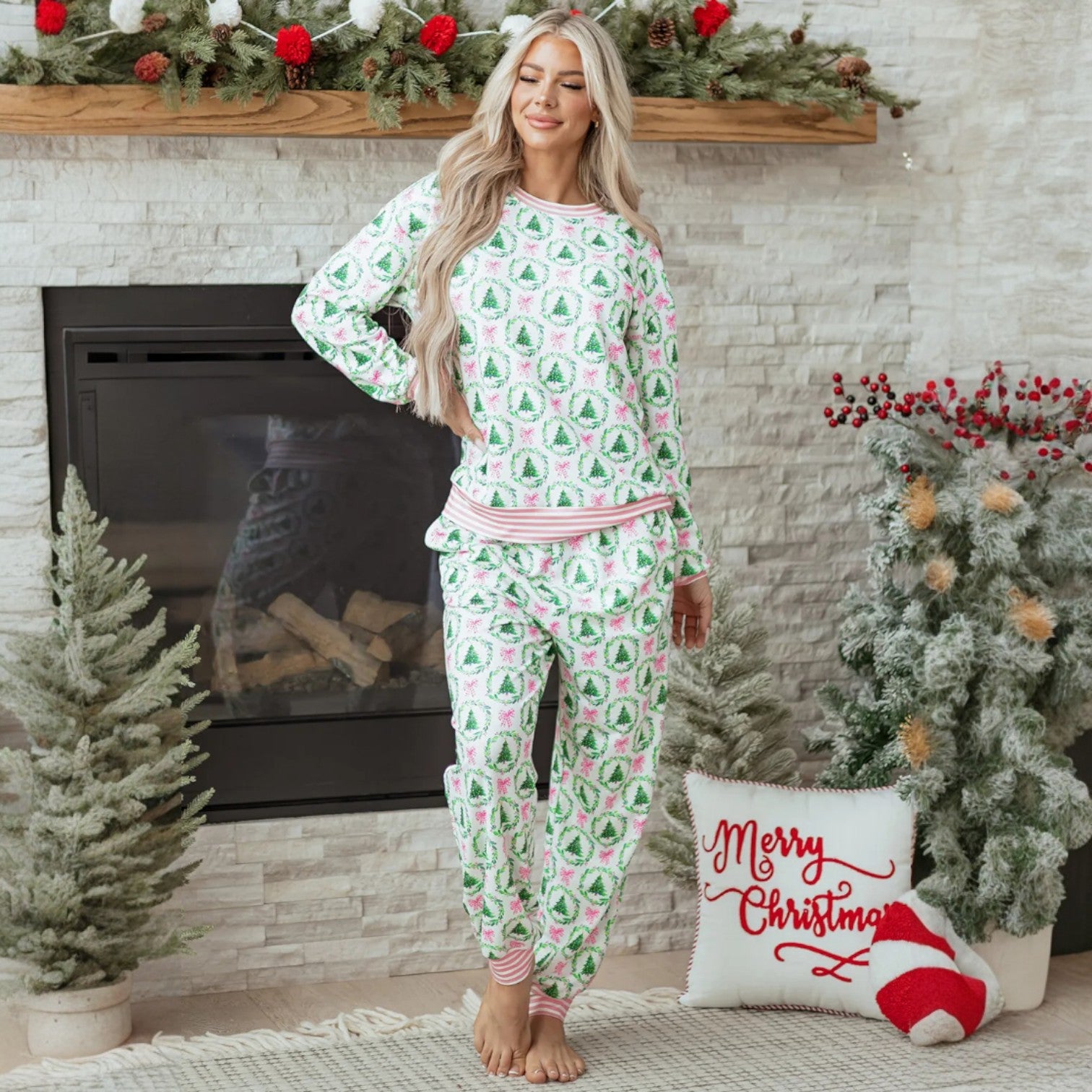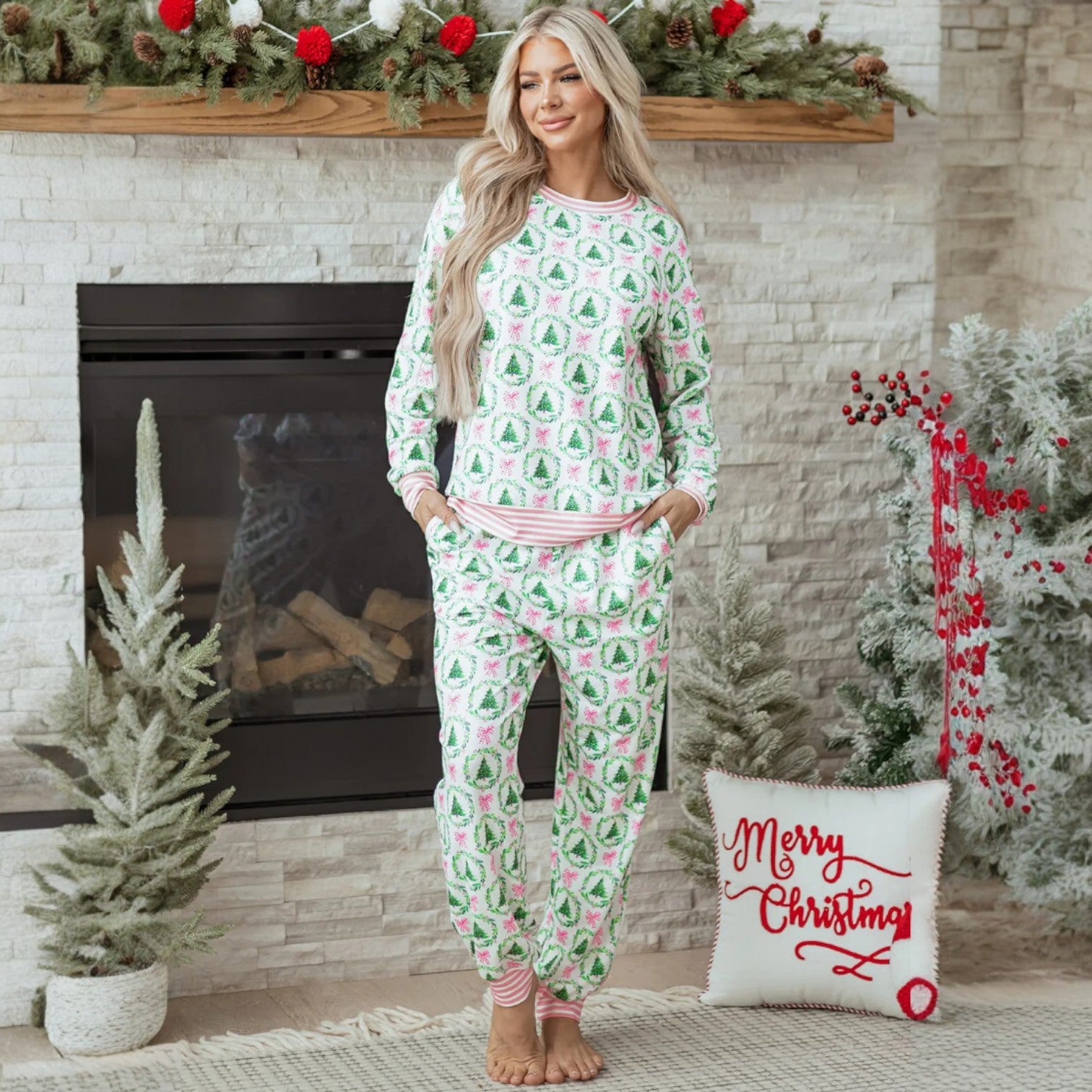 Model showcases the Love Language Lounge Set with heart-print lounge pants and a relaxed fit top.
