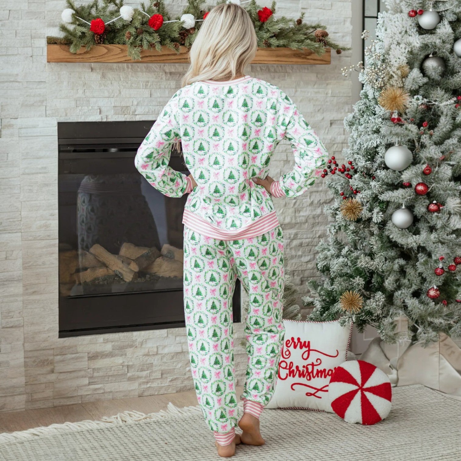 Cozy Love Language Lounge Set featuring ruffled top and heart-print pants, perfect for relaxed self-care nights.