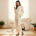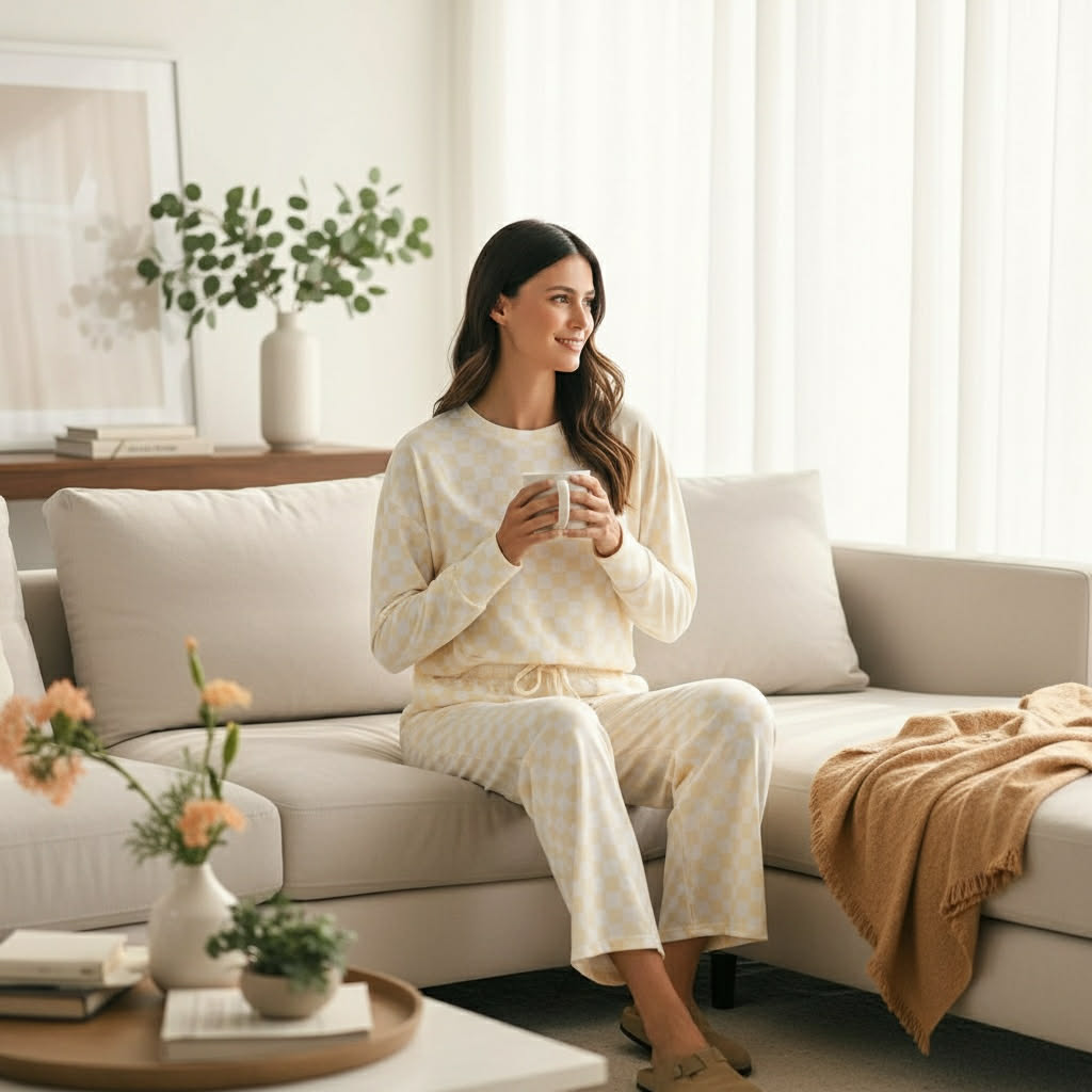 Soft, stretchy, and effortlessly cozy — the Calm Check Lounge Set is your new go-to for relaxed days and comfy nights. Featuring a subtle cream check pattern, this set blends timeless style with all-day comfort. The fabric is buttery soft with incredible stretch, making it perfect for lounging at home, casual errands, or travel days when comfort matters most.