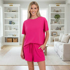 The short sleeve round-neck top features a relaxed fit with a flattering drape that pairs perfectly with the coordinating elastic-waist shorts. Designed with functional side pockets and an easy pull-on fit, this two-piece set blends comfort and practicality for busy days, travel, lounging, or casual outings.