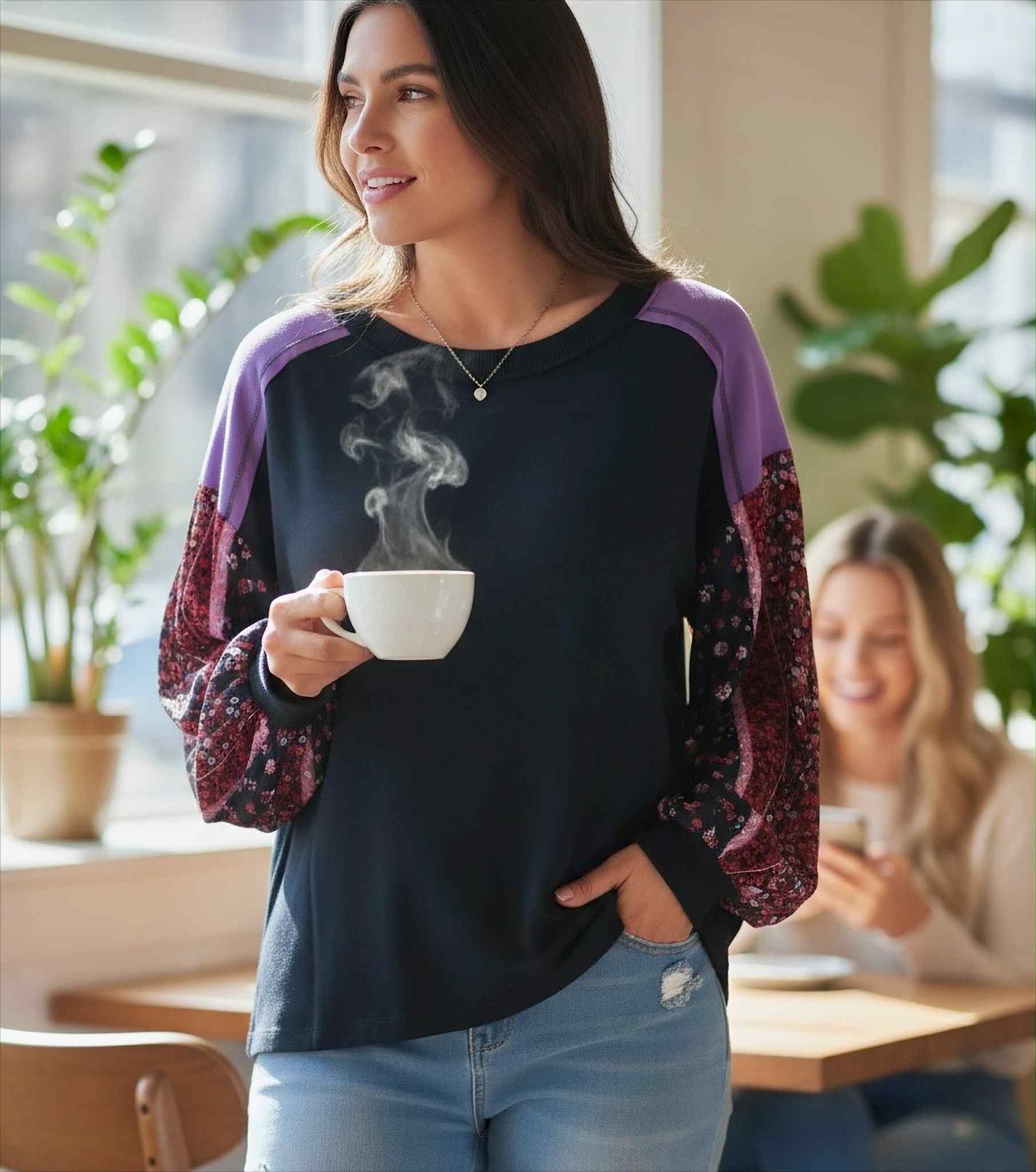 AZURE AVENUE TOP- - Umgee model wearing a stylish blue top with patterned 3/4 sleeves outdoors.