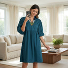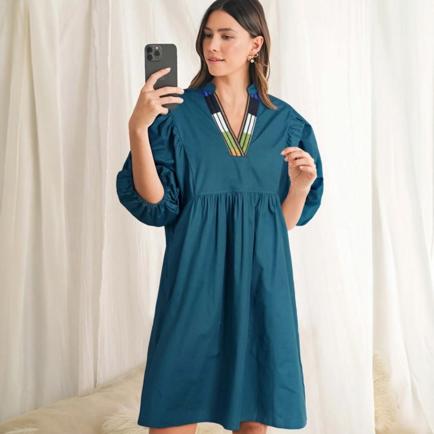 The Aurora Dawn Dress is where deep teal blue meets playful detail. 🌊✨ Crafted in 100% cotton, this mini dress blends comfort with effortless style.
