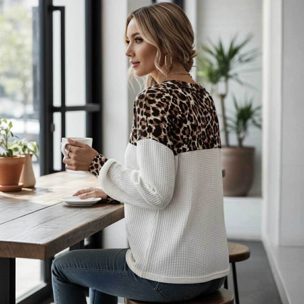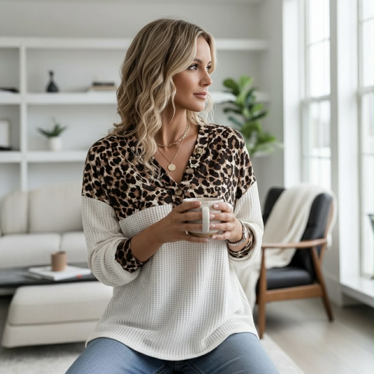 White Leopard Waffle Knit Patchwork Button V-Neck Top