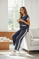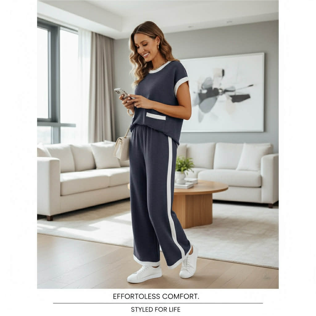 ⚓ Step into effortless coastal chic with this navy blue two-piece pants set. Designed with a modern contrast trim for a colorblock effect, this look is both timeless and trendy!