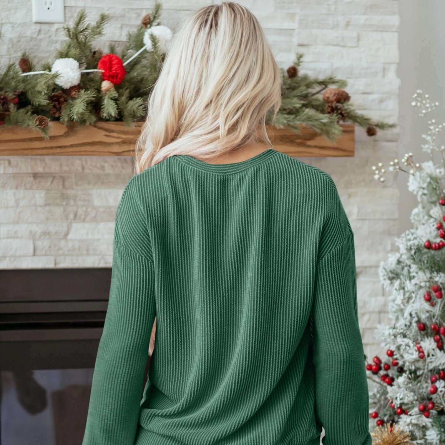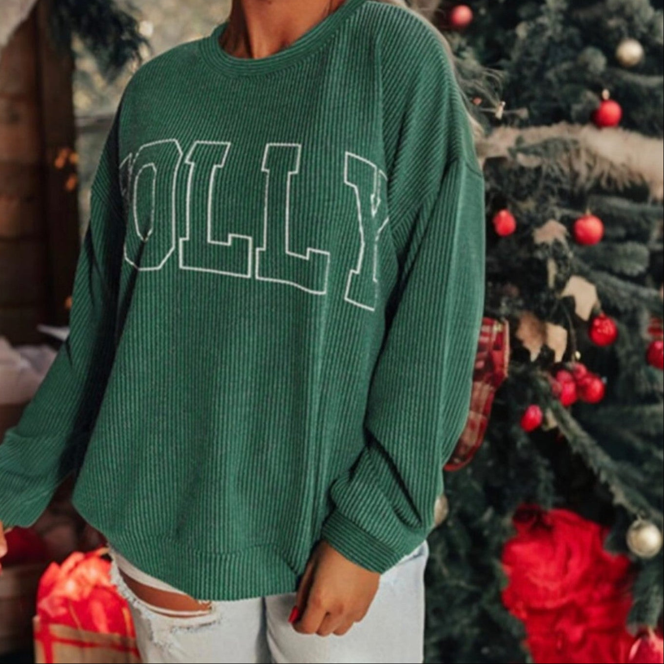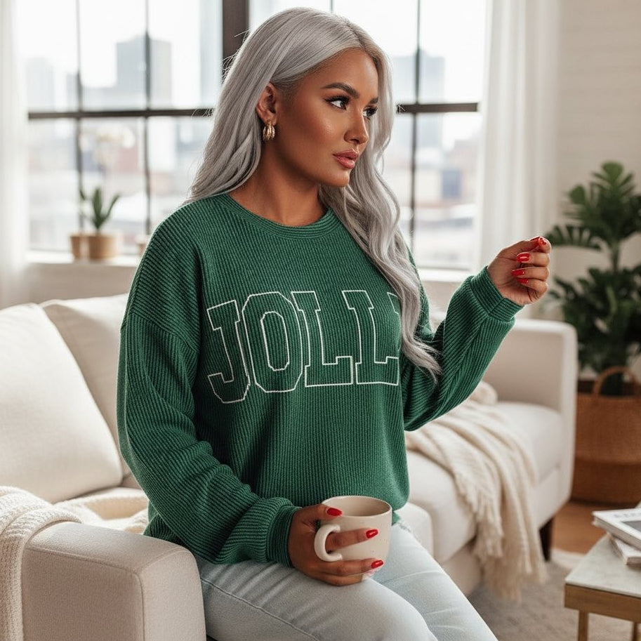✨ Jolly Holiday Vibes Ribbed Top – Dark Green Corded Merry Letter Crewneck