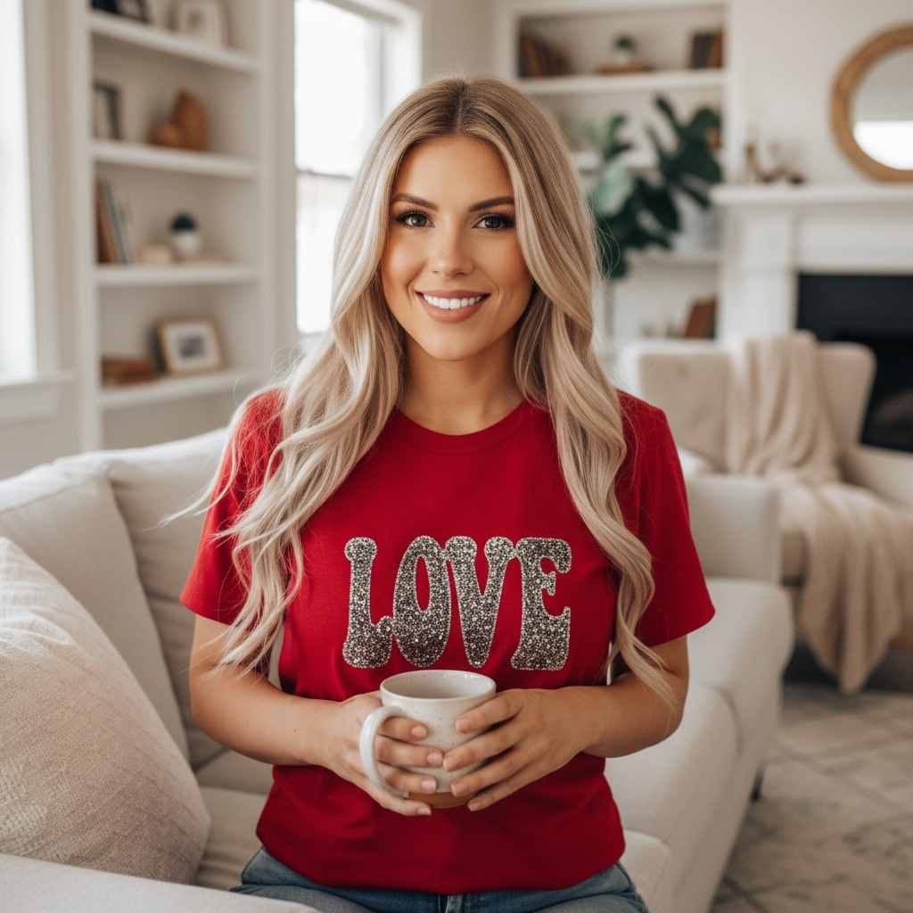 Add a touch of romance to your summer outfits with this must-have Love Letters Tee. Its breathable fabric, round neck, and short sleeves ensure comfortable wear. The shiny sequined "LOVE" pattern will make you stand out on Valentine's Day. Style it with jeans, shorts, or a skirt for a sweet and stylish date.
