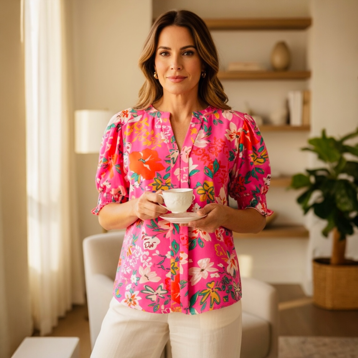 Bring sunshine and tropical vibes wherever you go in this vibrant rose floral blouse! 🌞 The lively mix of pink, red, yellow, and green blooms pops beautifully against the bold background, making this the ultimate cheerful-chic piece for your wardrobe.