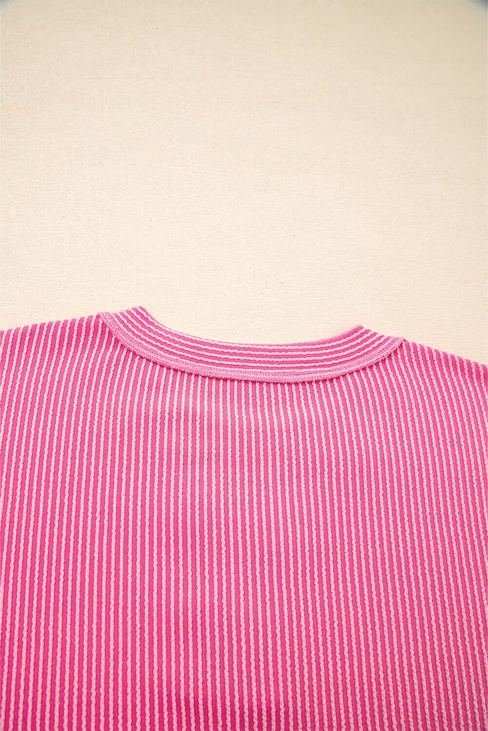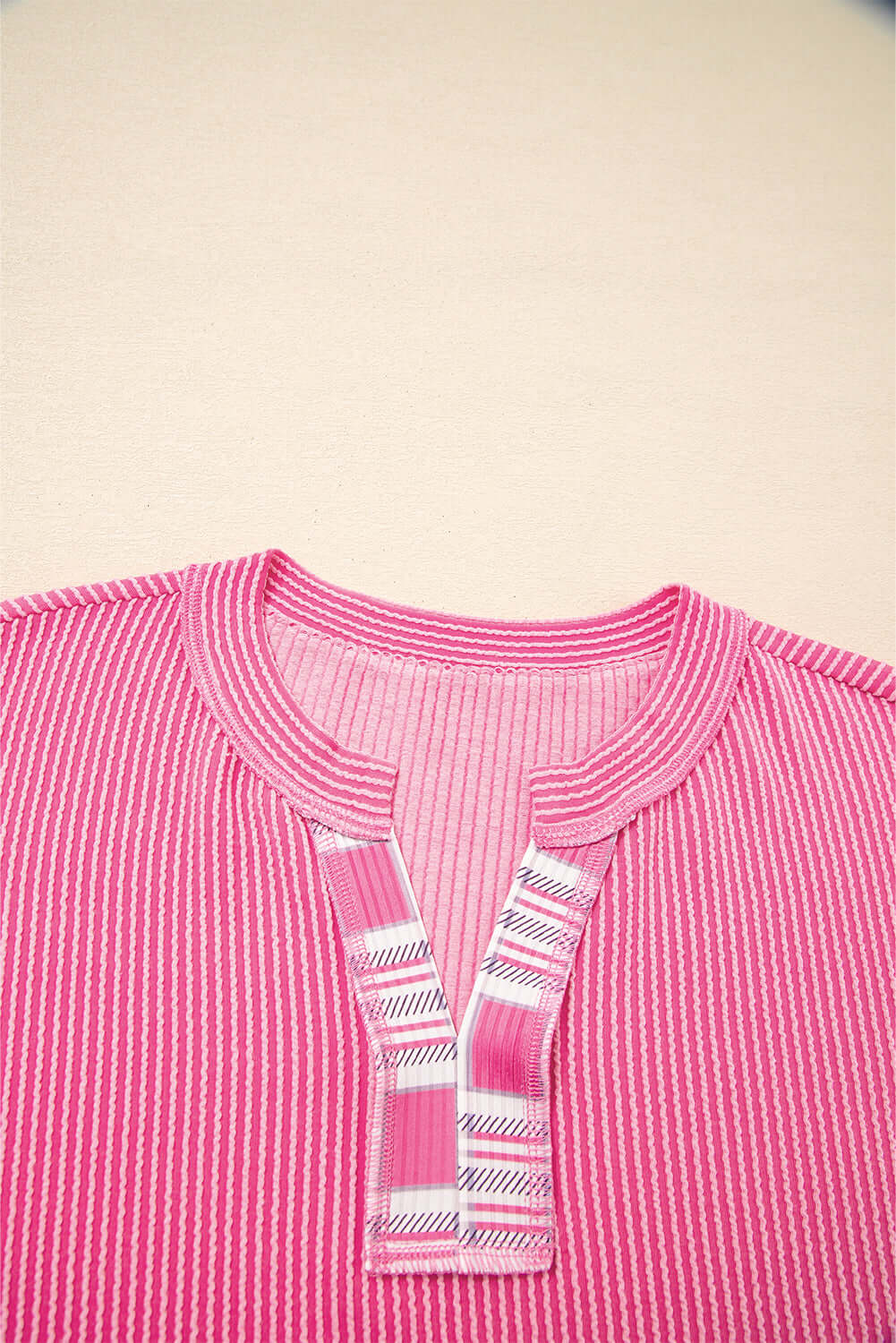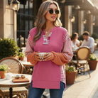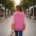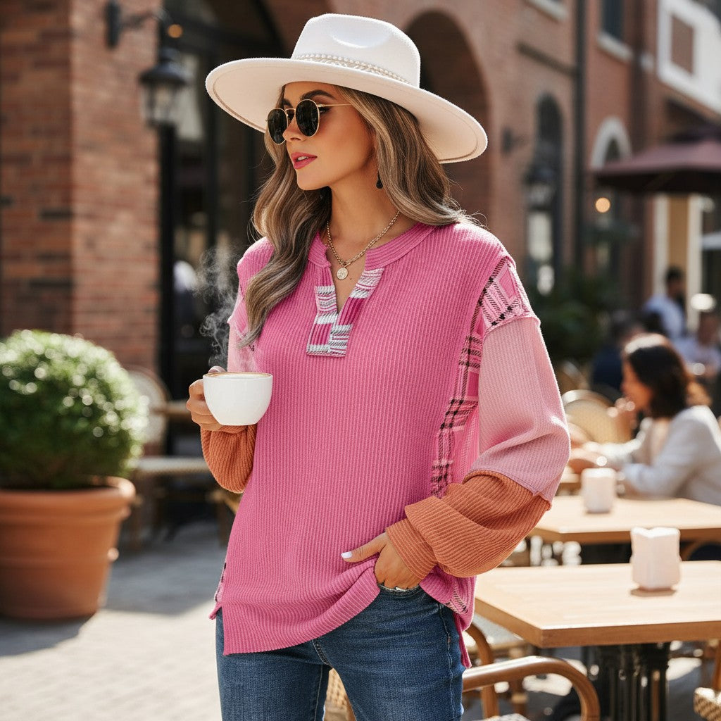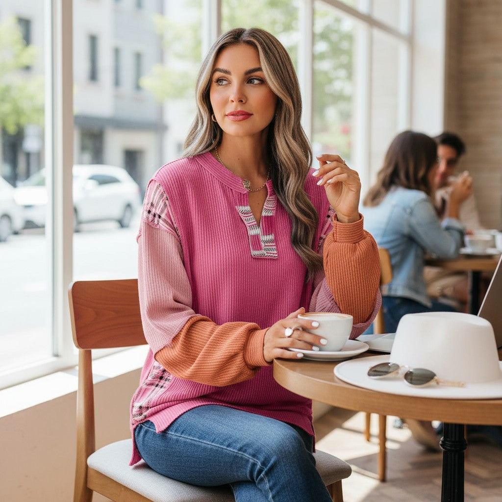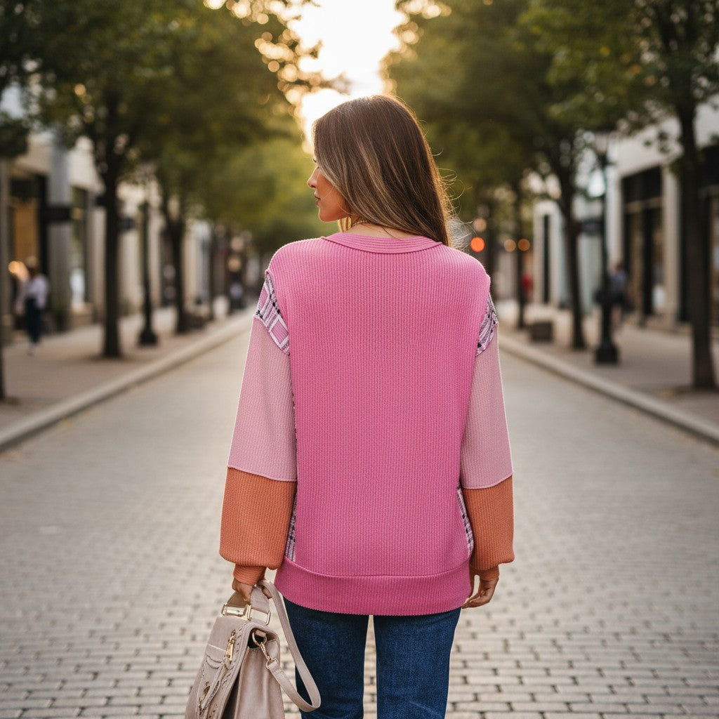 🌸 Pink Parkway Ribbed Pullover – Playful Patchwork Meets Everyday Charm 🌸