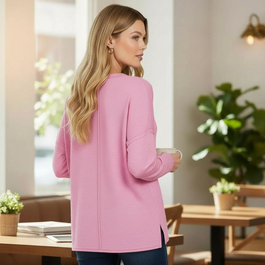 Meet your new everyday essential! This super soft melange hacci knit gives you the perfect blend of stretch, comfort, and casual style. The relaxed round-neck silhouette keeps things easy and flattering — ideal for layering or wearing solo through every season. 💕