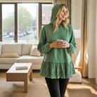 ADVENTURE AWAITS with this Pre-washed Cotton French Terry Hoodie Top by Cotton Bleu! This gorgeous shade of green will make you stand out while you stay cozy and comfy in its soft, oversized design. The hoodie and long sleeves, along with the dropped shoulder seam and eyelet ruffle on the bottom, add a touch of style to this must-have piece. Don't miss out on this perfect combination of fashion and comfort!