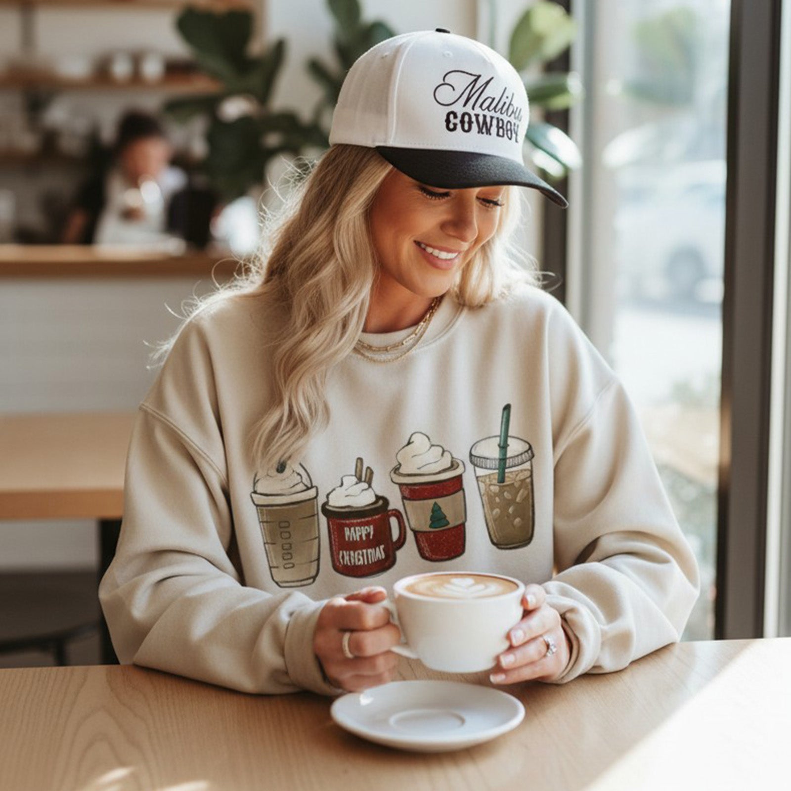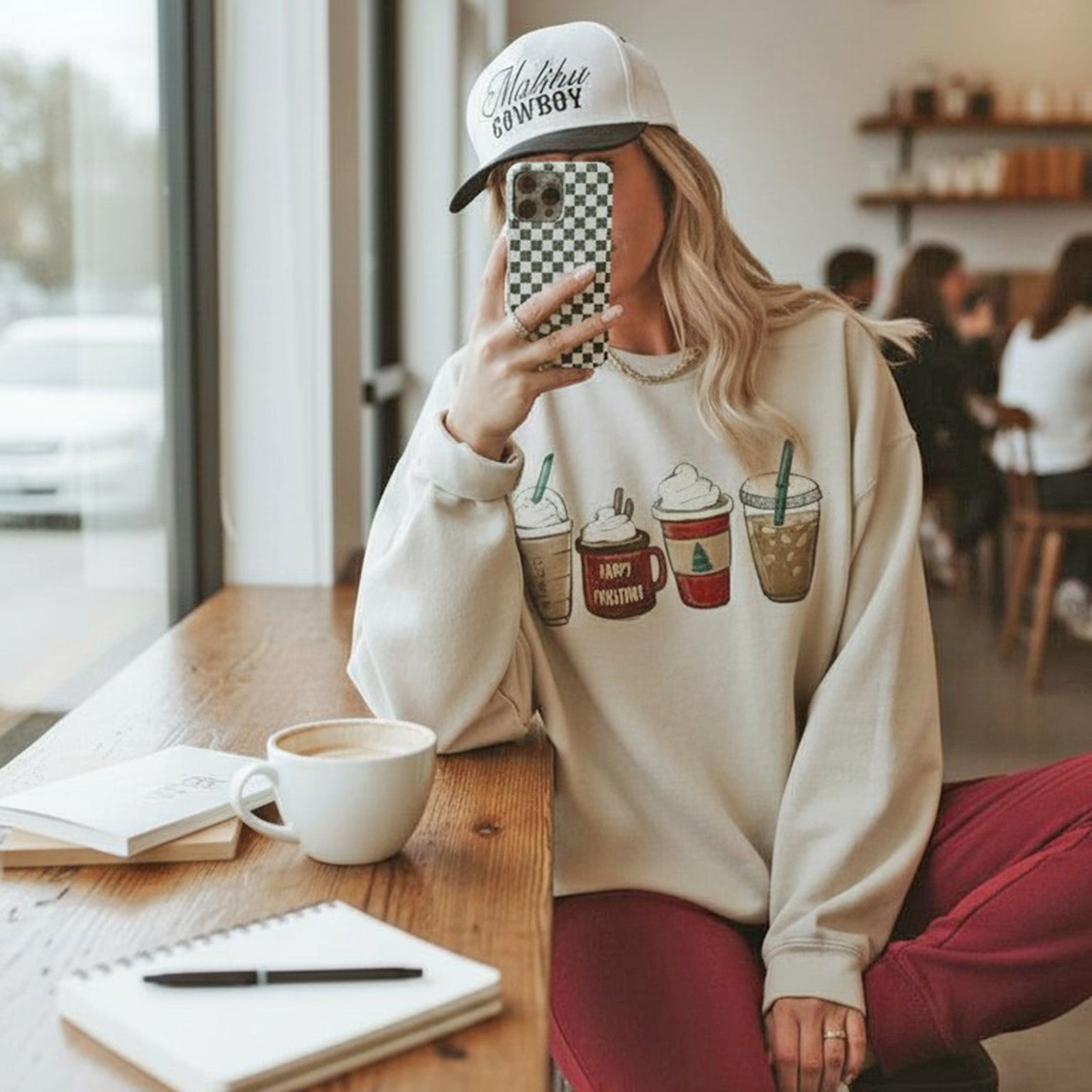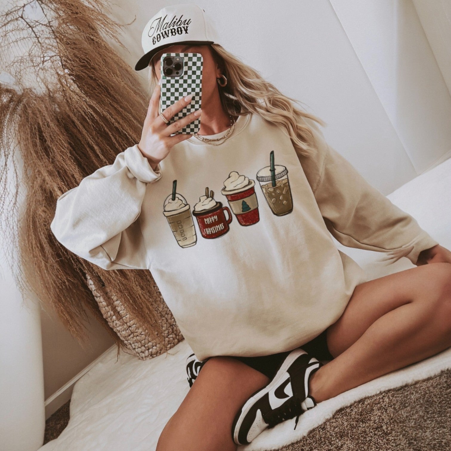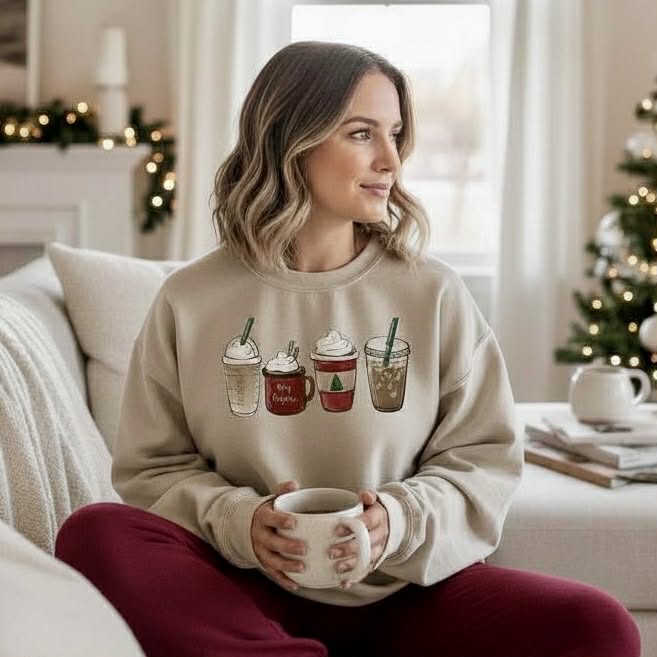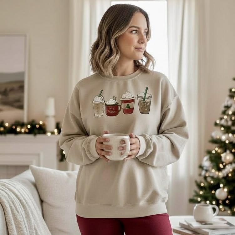 Warm, playful, and full of festive spirit — this holiday crewneck features four adorable Christmas-style coffee cups, complete with whipped cream and winter charm. The neutral beige tone makes it versatile and wearable well beyond December.