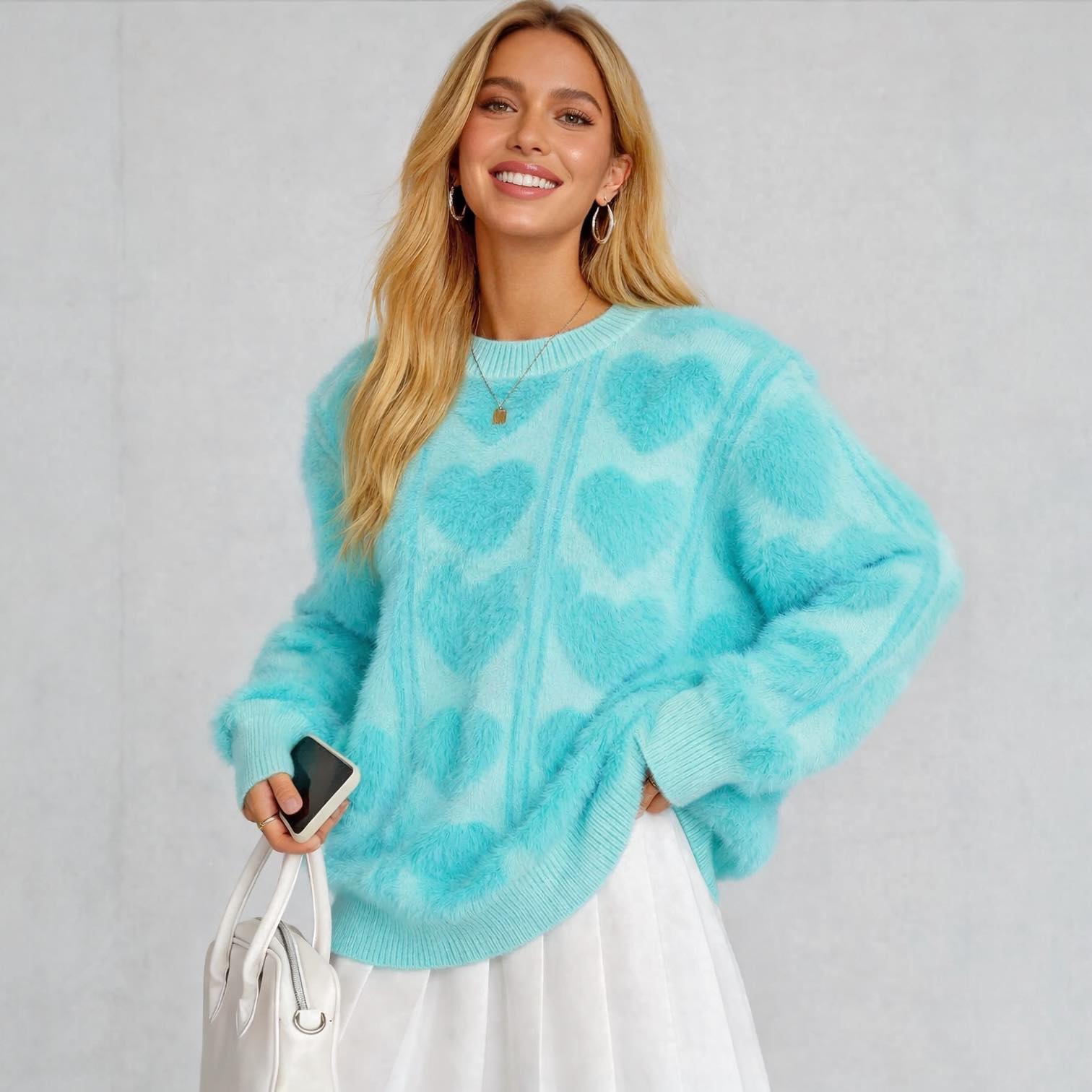 This ultra-soft faux mink sweater is truly love at first touch 🤍 Designed with plush heart detailing and a dreamy, fuzzy texture that feels like a cloud of cozy goodness, this pullover brings comfort and charm together effortlessly.