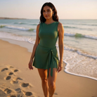 Crafted from a premium yoga fabric blend (82% polyester, 18% spandex), it offers breathable stretch, moisture-wicking performance, and a buttery-soft feel. The sleeveless design and built-in under-shorts with a secure right-side pocket provide coverage and convenience, while the chic front tie detail adds a polished, feminine touch.