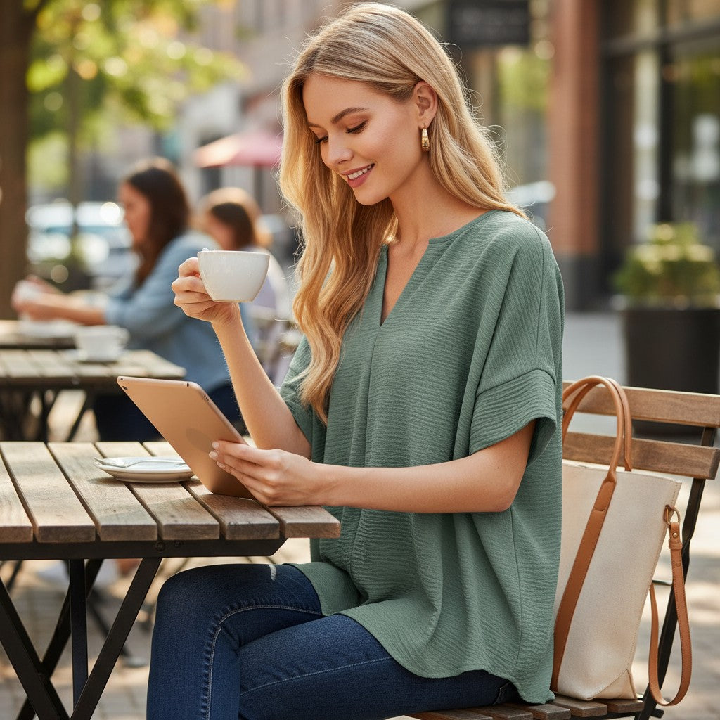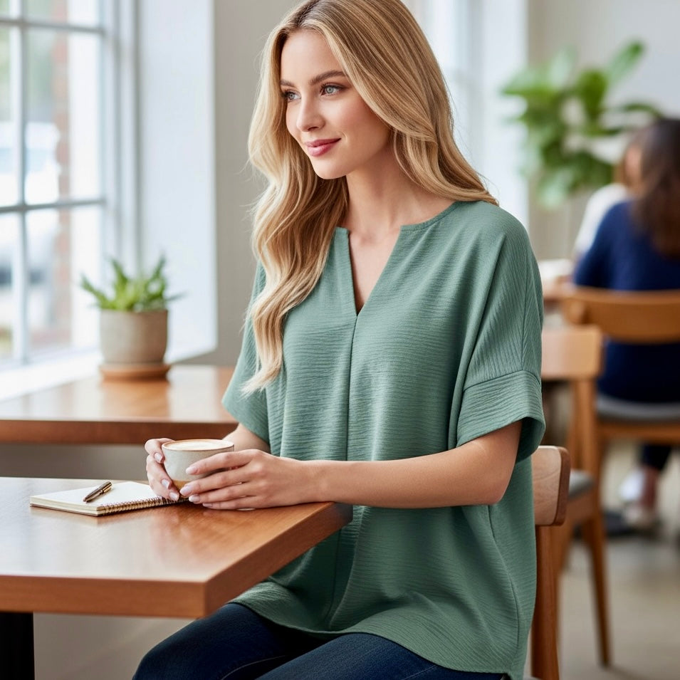 Indulge in effortless comfort with the Soft Breeze Top, a boutique favorite you’ll reach for again and again. Crafted in lightweight woven airflow fabric, this top delivers the perfect balance of breathability and style, keeping you cool and chic no matter the season. The Ash Jade hue makes it a versatile fall essential that pairs beautifully with jeans, skirts, or tailored pants.