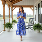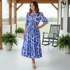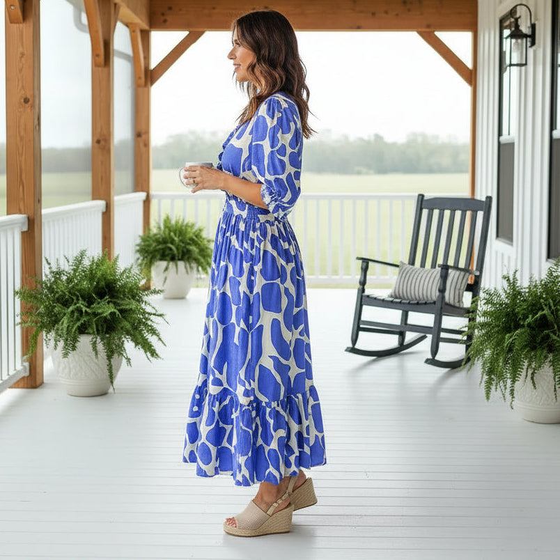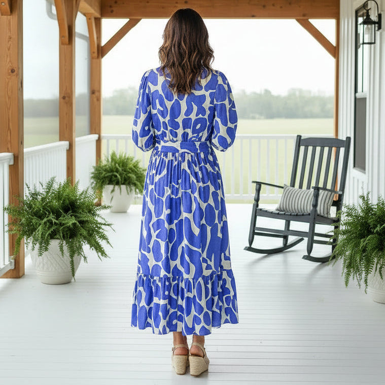 This long dress is truly unique and eye-catching with its bold sky blue abstract print that feels both modern and timeless.