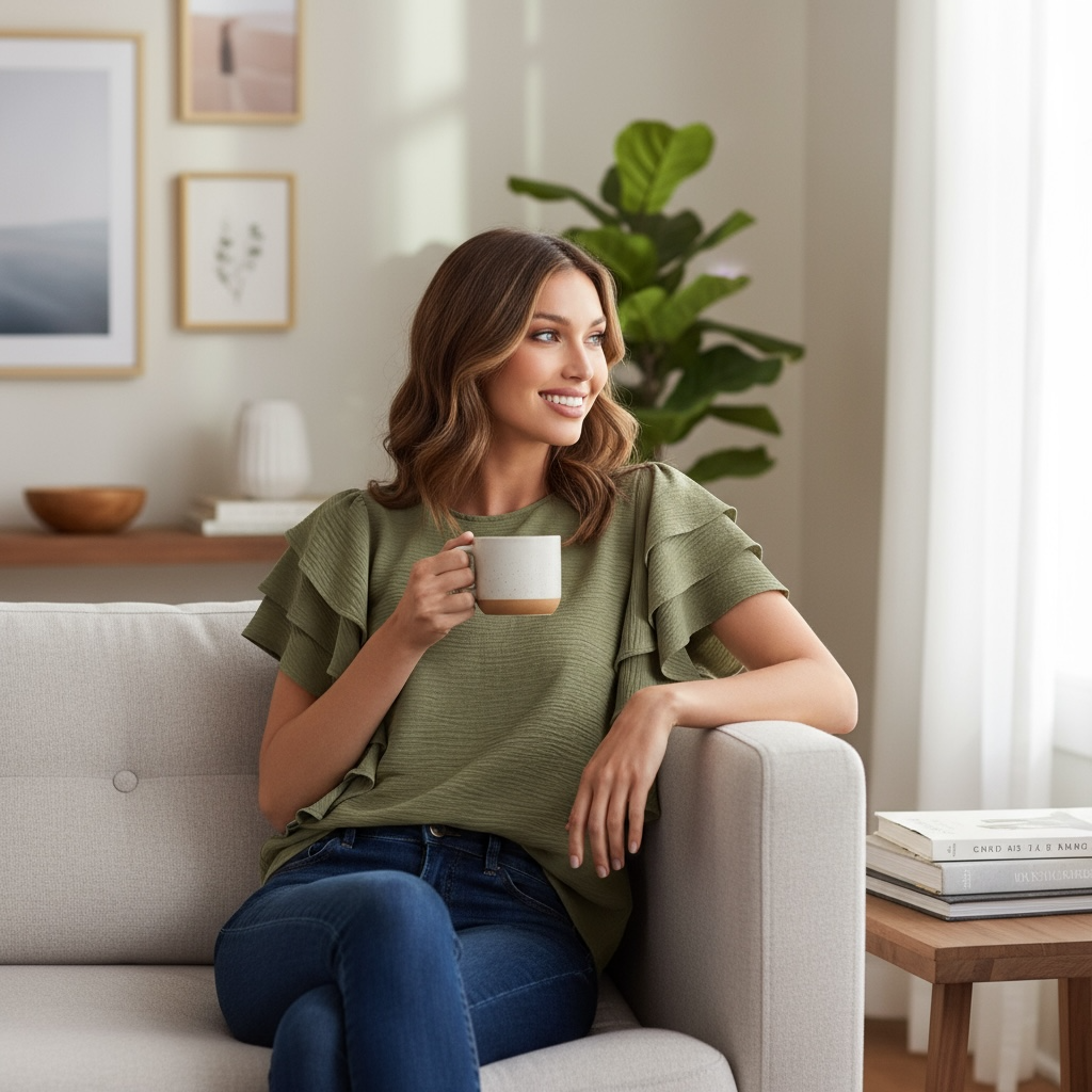 Breathe easy in this airy woven top, designed for effortless style and all-day comfort. The multi-tiered ruffle sleeves add a soft, feminine touch, while the lightweight airflow fabric keeps you cool and chic. Perfect for work, weekends, or special outings, this versatile piece transitions seamlessly through every season.